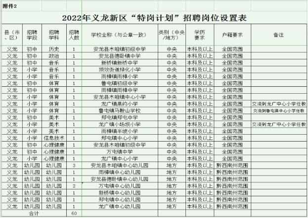 通过实施国家、县级“特岗计划”,解决我区农村教师数量不足和结构不合理等问题,提高农村教师队伍整体素质。义龙新区“特岗计划”指标60名,其中国家“特岗计划”指标50名,县“特岗计划”指标10名(具体指标分配详见附件1)