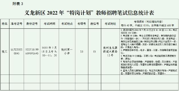 义龙新区教育局对资格审查合格人员名单进行汇总审核,并对其参加笔试考试的准考证信息进行编排后填写《义龙新区2022年特岗教师招聘笔试信息统计表》(附表2),连同考务工作安排于2022年7月9日下午6点前以电子邮件形式报州教育局。