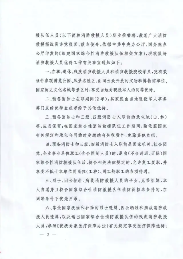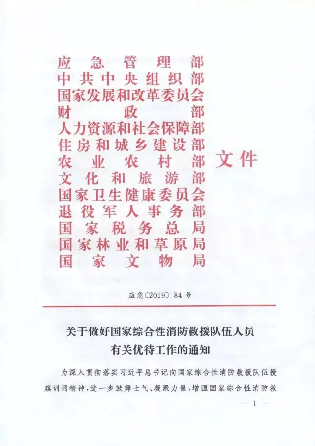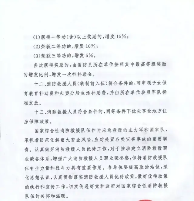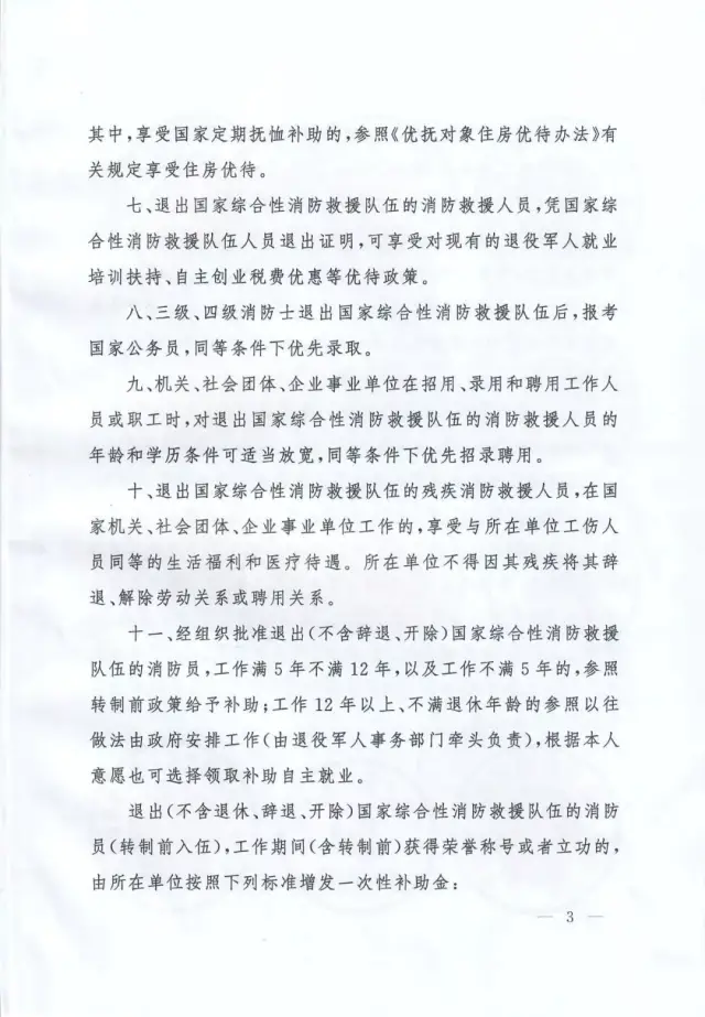国家发展改革委员会、教育部、财政部、人力资源社会保障部、交通运输部、退役军人事务部等部委与应急管理部联合出台的《关于做好国家综合性消防救援队伍人员有关优待工作的通知》(应急〔2019〕84号)、《关于保障国家综合性消防救援队伍人员交通出行优待权益有关事项的通知》(交运规〔2019〕4号)等文件,明确国家综合性消防救援队伍人员在伤亡抚恤、退出安置、就业创业、家庭优待、子女入学、住房医疗、交通出行、参观游览等方面享受专门优待政策。