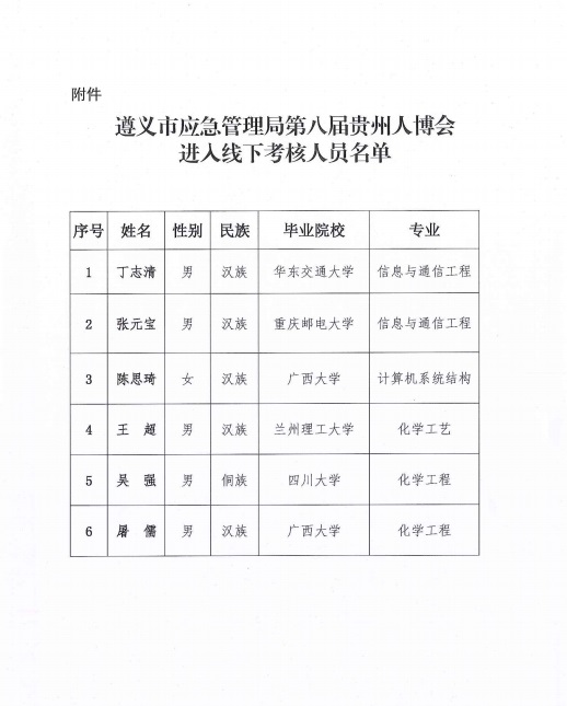 贵州人才引进招聘考试信息网遵义市人才引进招聘信息:2020年第八届贵州人博会遵义市应急管理局线下考核人员公示已发布,公示时间2020年5月28日-6月3日。
