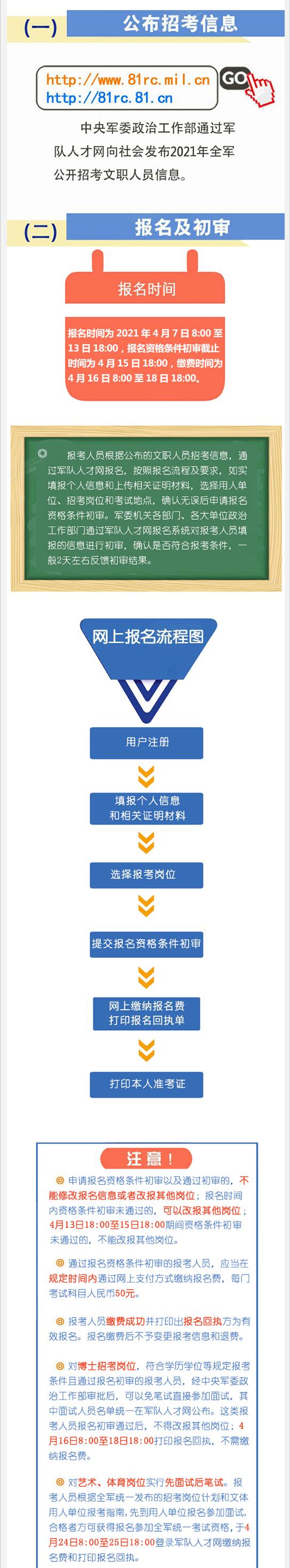 (一)公布招考信息。中央军委政治工作部通过军队人才网(网址:http://www.81rc.mil.cn或者http://81rc.81.cn),向社会发布2021年全军公开招考文职人员信息。
