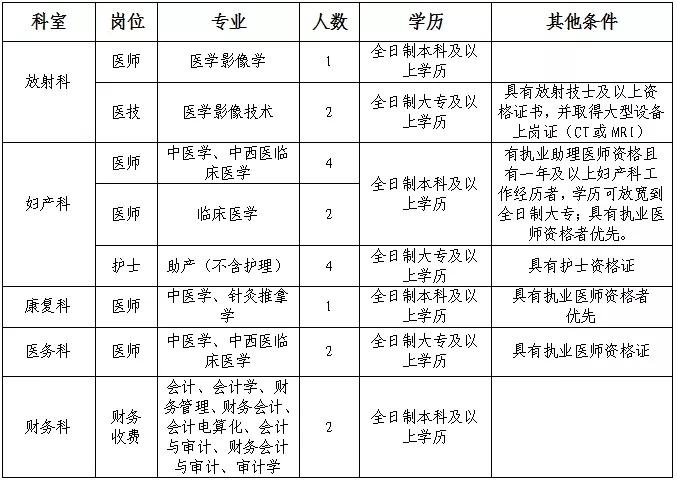 1、身体健康,五官端正,肯吃苦能耐劳,有较强的奉献精神。女性身高:155cm以上,男性身高:165cm以上。医师、医技人员年龄要求在18周岁以上,35周岁以下(出生日期截止到1986年7月31日),具有主治医师资格者,年龄可放宽至40周岁(出生日期截止到1981年7月31日),财务、护理人员年龄要求在18周岁以上,28周岁以下(出生日期截止到1993年7月31日)。