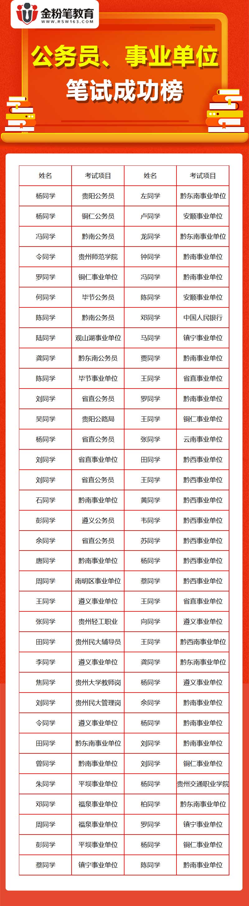 金粉笔教育贵州人事考试信息网声明:贵州163人事考试信息网发布招聘考试信息来源于贵州人事考试信息网、贵州人力资源与社会保障局及贵州各地市人事考试信息网、人民政府网站、教育网、人力资源与社会保障局发布招聘公告信息,包括公务员招录考试、事业单位招聘、教师招聘、医疗卫生人才招聘、国企招聘、银行系统、人才引进招聘等