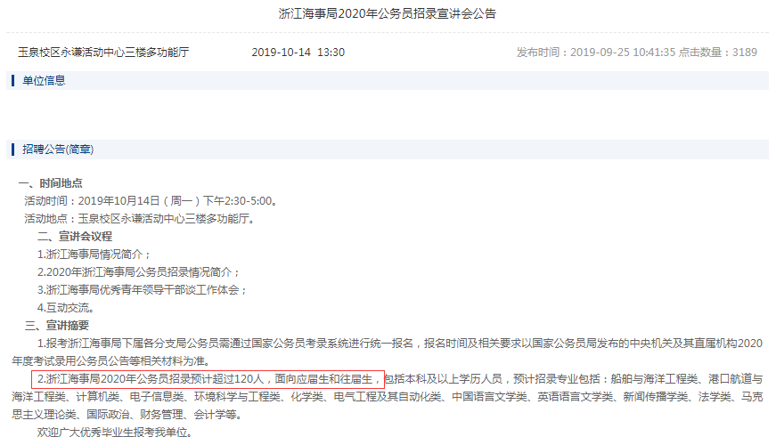 2020年国考又有新消息啦!近日,浙江大学就业指导与服务中心发布了《浙江海事局2020年公务员招录宣讲会公告》,公告表明宣讲会即将在10月14日开讲,2020年国家公务员考试浙江海事局预计招录将超过120人。详情如下: