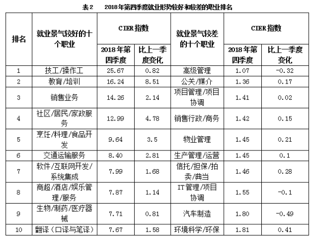 CIER指数用来反映就业市场景气程度,其计算方法是:CIER指数=市场招聘需求人数/市场求职申请人数。根据有关机构发布的数据,2018年第一季度CIER指数为1.91,第二季度为1.88,第三季度为1.97,第四季度为2.38。2018年第三季度,招聘需求人数环比下降20.79%,求职申请人数环比下降24.37%;第四季度,招聘需求人数环比增加25.42%,求职申请人数环比增加3.9%。
